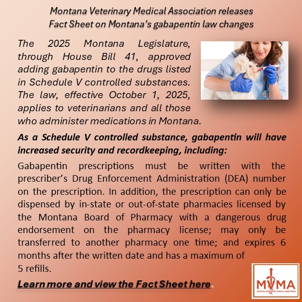 We are the voice of the Montana Veterinary Medical Association, with the goals of advancing the science and art of veterinary medicine,especially as they relate to public health and agriculture in Montana.Join TodayFor information on proper disposal of prescription medications, click here.Thank you, Summer Meeting Sponsors!A Message from the Executive Director: